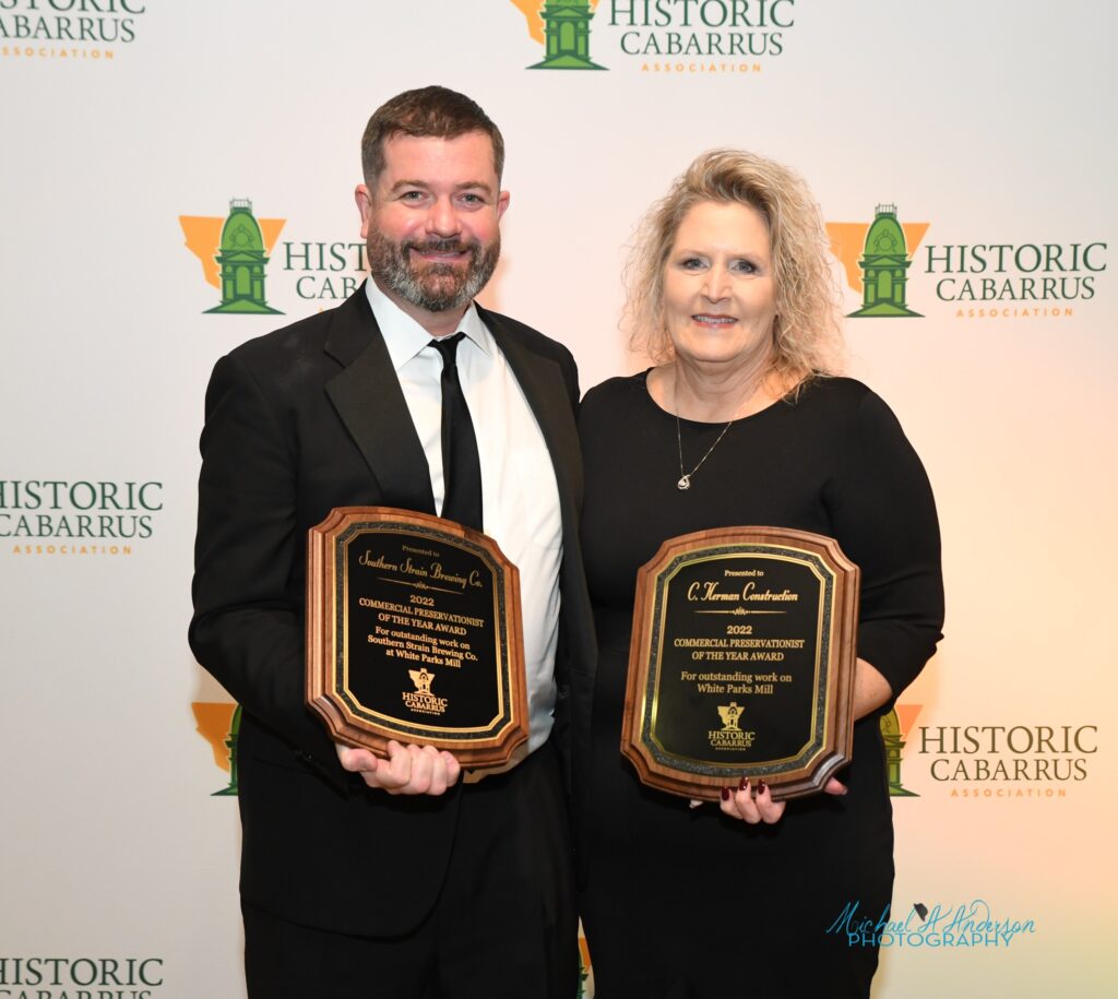 The photos show past recipients with Chairman John Misenheimer presenting to historian Bernard Davis, Jr., and Ford Craven of Southern Strain Brewing Co. with Kara Klunk of C. Herman Construction. Other past recipients include Dr. Allen Dobson, Hon. Clarence E. Horton, Jr., Larry Hayer, Dr. Grier Harris & Minnie Ellen Harris, Michael & Randy Hopkins, Laura Purvis, Brice Biehle, Rehab Development, and Niblock Homes.
